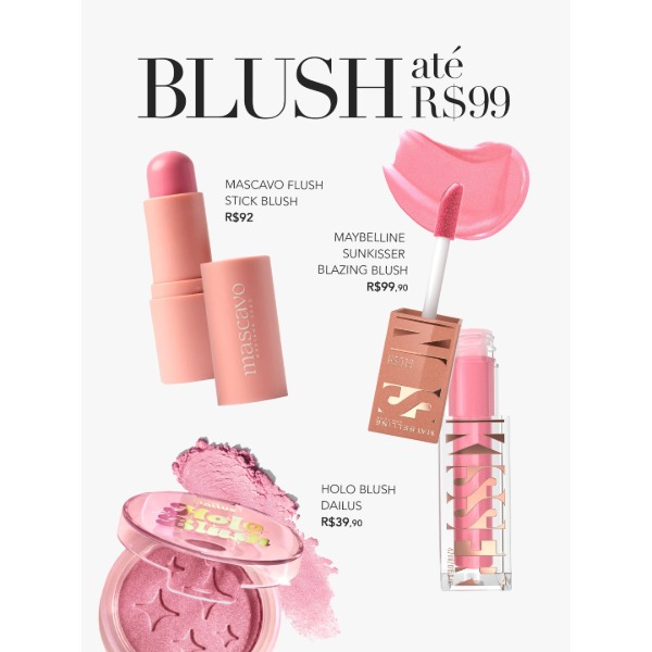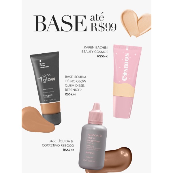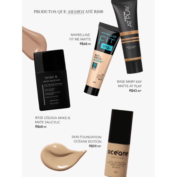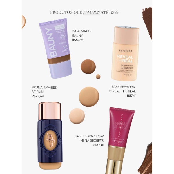 Tem bases, corretivos, blushes e iluminadores. Tudo testado, aprovado e com preço bem legal.