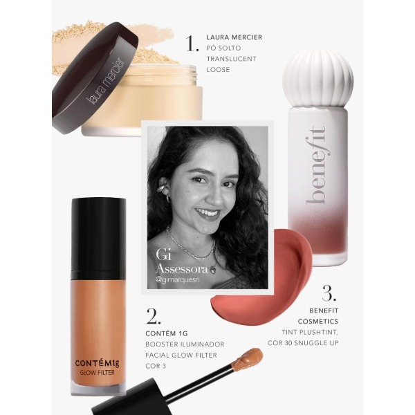 E claro, não se esqueça do toque final: o iluminador em pó aplicado nas têmporas, que valoriza os pontos altos e deixa a pele com um glow impecável.