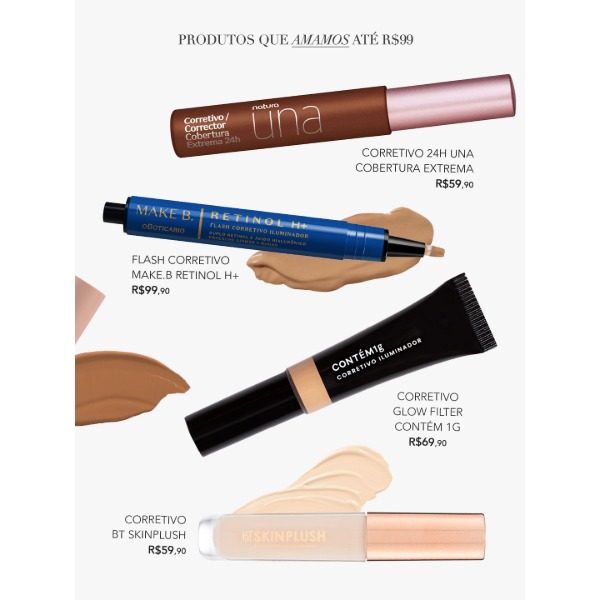 Tem bases, corretivos, blushes e iluminadores. Tudo testado, aprovado e com preço bem legal.
